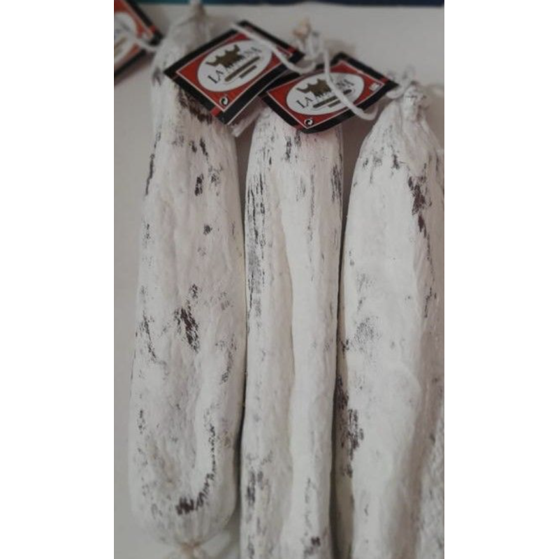 Salchichón Campero La Almena, salchichón artesano, de forma un poco aplanada típico de este tipo de embutido, en su punto justo de una maduración natural que le da un sabor único con mucha personalidad.